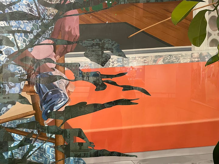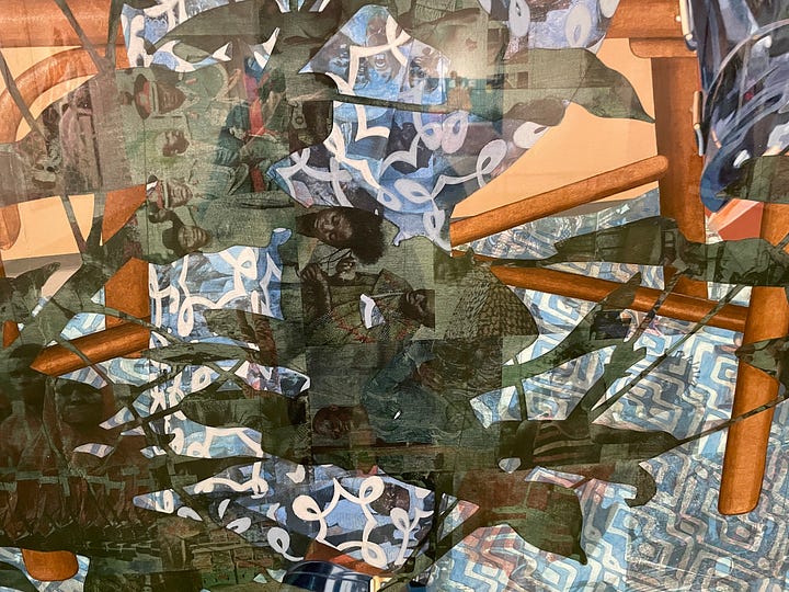 I’m inserting a detail from the painting that I hope will entertain my Nigerian subscribers. Thanks to Najwa and Salimat, I am blessed with some cool readers from that part of the world. (Check out their newsletters The perks of being Najwa and Walking with Salimat.) I wish you writers could have been standing next to me at the exhibition; I’d have loved a guided tour of Nigerian pop culture via the intriguing transfers on this wonderful picture.